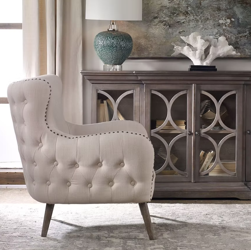 The Donya Accent Chair brings timeless sophistication to any room. Its wingback design offers a cozy, intimate feel, perfect for quiet conversations or curling up with a glass of wine. The chair’s cream linen blend fabric adds softness, while the button tufted surround and antique bronze nail heads give it a refined look.